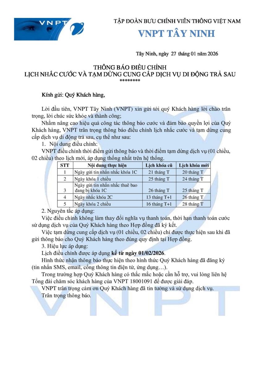 VNPT Tây Ninh thông báo điều chỉnh lịch khóa máy đối với thuê bao di động trả sau